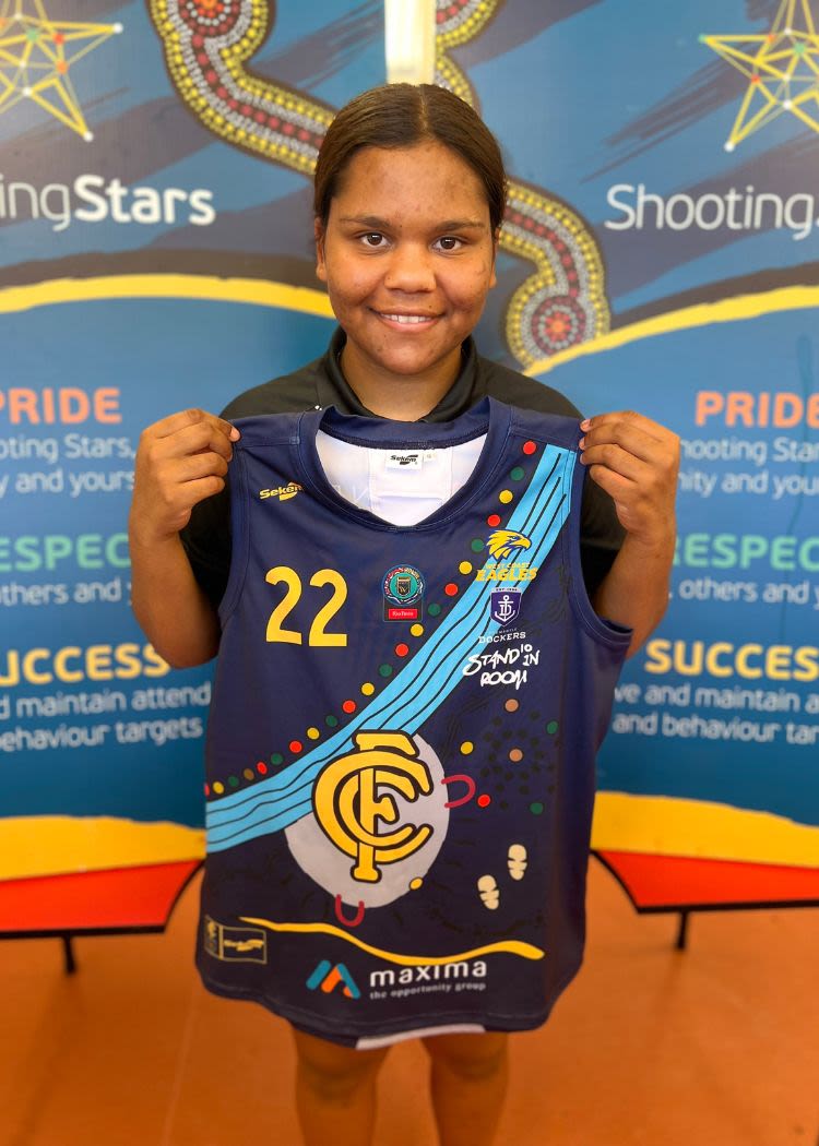 Ahead of the Indigenous round in the Women’s AFL league, the Claremont Women’s Football Club held a competition to design the guernsey that would be worn that round. Our very own Halls Creek participant, Skye, won the competition and watched the girls run out onto the field wearing her design.