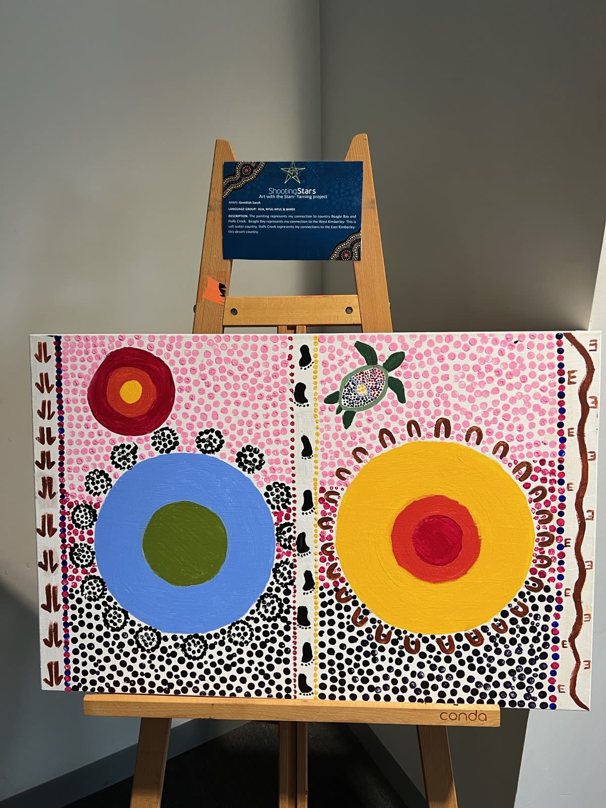 The gift was a beautiful ice-brick style art piece designed by one of our Shooting Stars participants, Kevi from Carnarvon. The design represents our values of Pride, Respect, and Success.